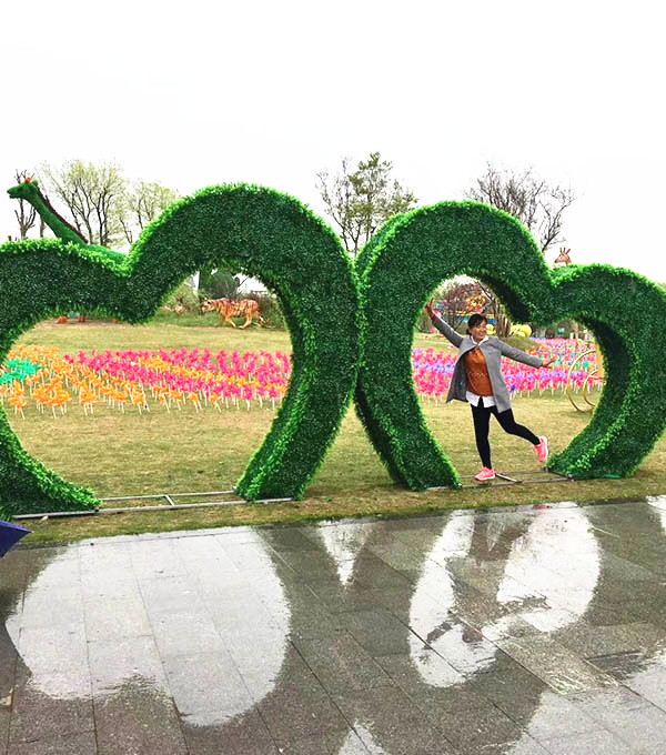 圖中的心形綠雕雖然結構比較簡單,但造型很別致,有心心相印的寓意,綠雕與周圍的風車等搭配起來,相得益彰,形成良好的景觀效果。